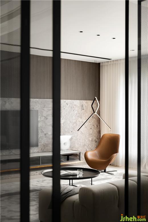 臨沂豪宅設(shè)計大面積原木家具連接頂部弧形木格柵吊頂、地面木地板,用相同調(diào)性的材質(zhì)打造空間溫度。