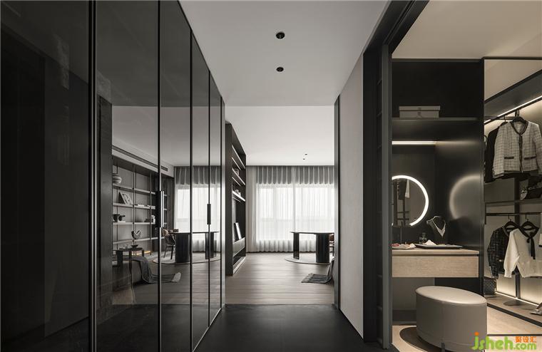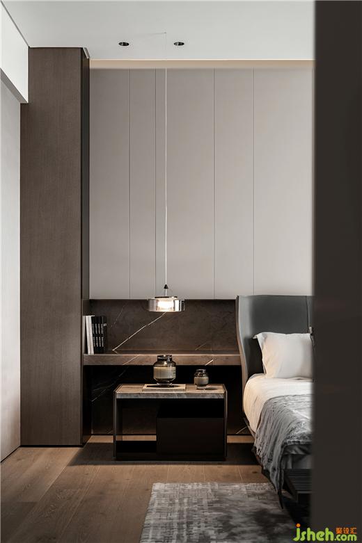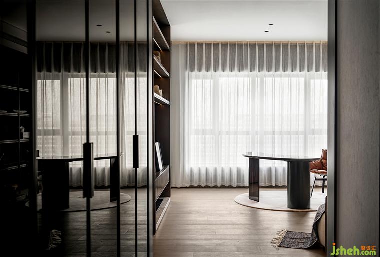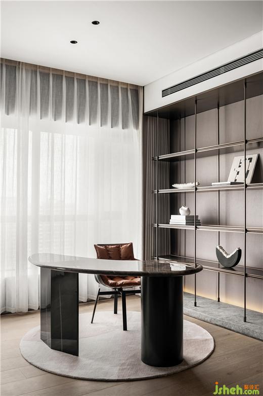 主臥睡眠區(qū)和書房之間的半墻,分別做電視墻和展示柜。臨沂豪宅設(shè)計(jì)通過界定而非阻隔空間的方式使整體空間上具備連貫性。