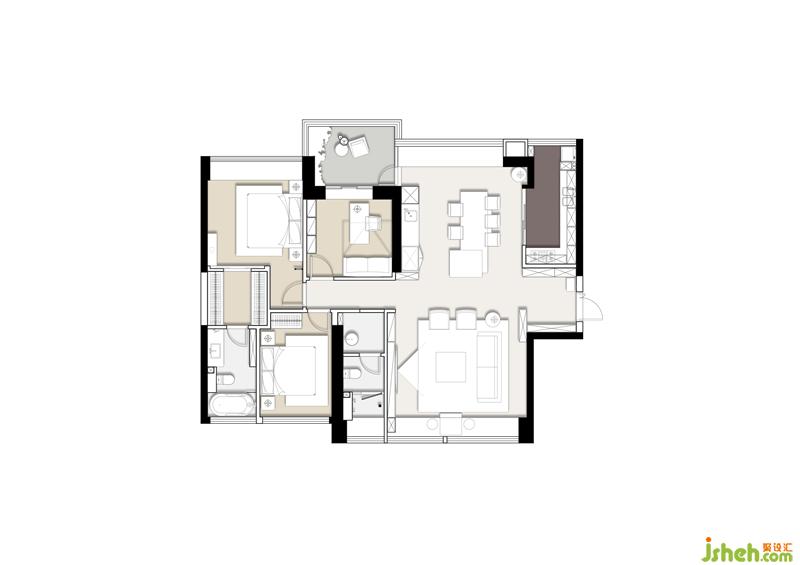 擺脫原有格局的限定,來一次空間規(guī)劃的變革,將客餐廳空間轉(zhuǎn)變,增加空間私密性更合理利用空間。修整過道,整體向陽臺次臥偏移,擴大公衛(wèi)與小房間的面積,也解決了大門與主臥門沖的問題,主臥原有凹角處也得到了修整,使空間實用率提高。并非加入多少復雜造型,充分填滿空間才是好的設計,而是在滿足空間功能性的同時,使整體活動流線更順暢,才是設計的核心目的。