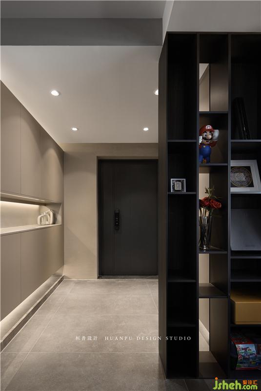 玄關擴大尺寸后,雙面高柜增加空間收納,進而提升美觀的感受,屏風隔擋采用了半通透柜子的形式,實用性更好的同時也做到了展示柜的作用。 玄關柜依舊是中間留有置物臺更為方便,提升使用感受,增加氛圍燈既有照明作用也起到了美觀的用作。