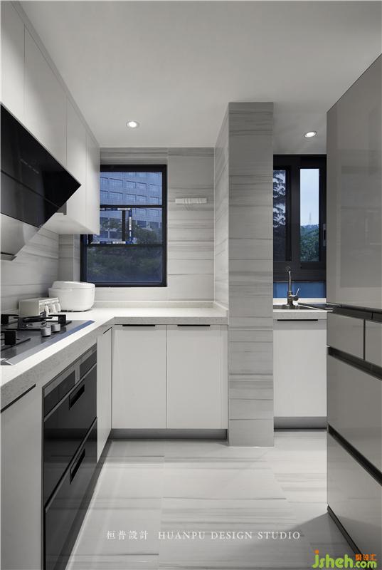 業(yè)主夫婦是對熱愛生活的夫婦,烹飪這一細節(jié)自然不能馬虎。通透的玻璃門連接廚房和整個客餐廳,使整個空間更具開放性。我們結(jié)合主人的烹飪習(xí)慣,以高級白為主調(diào),為其打造精致的廚房空間。
