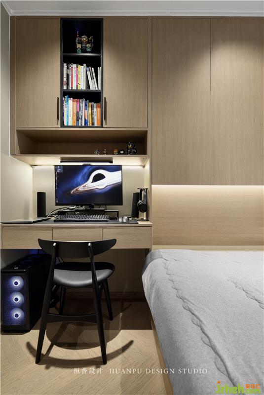 次臥同時兼?zhèn)鋾亢涂头康淖饔?,墻面是整片的儲物柜,整體色調(diào)同樣偏低飽和,無論是平時工作還是客人入睡,都會相當舒適。