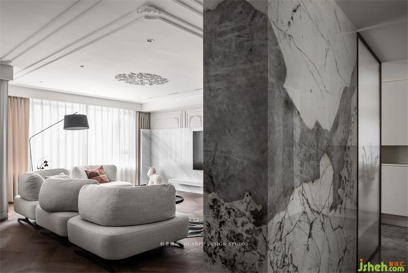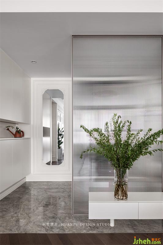 由于業(yè)主熱衷于不同的材質(zhì)拼接,所以玄關(guān)處的地板選用的是大理石,而客廳選用的是木地板。其之間還用了屏風(fēng)和連紋巖板進(jìn)行隔斷,分割成了兩個(gè)獨(dú)立的空間。在挑選屏風(fēng)時(shí)選擇了長虹玻璃,可以優(yōu)化玄關(guān)的采光,增加了室內(nèi)的朦朧美感。同時(shí)增加了空間的通透感,但也保留了一絲神秘感。
