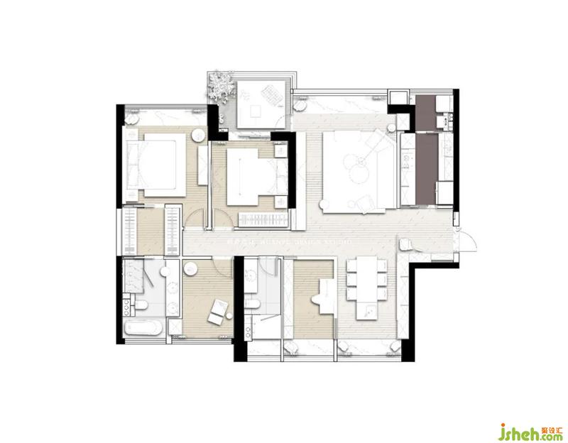 調(diào)整部分空間格局,擴(kuò)大廚房、衣帽間、衛(wèi)生間區(qū)域。