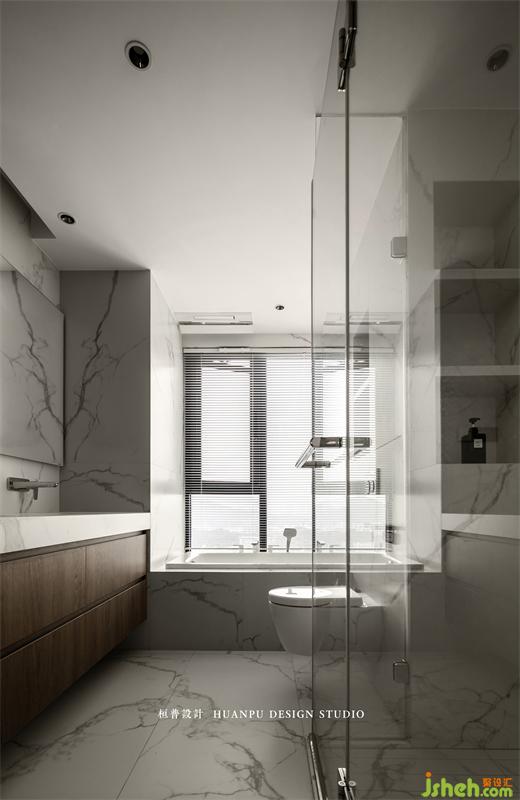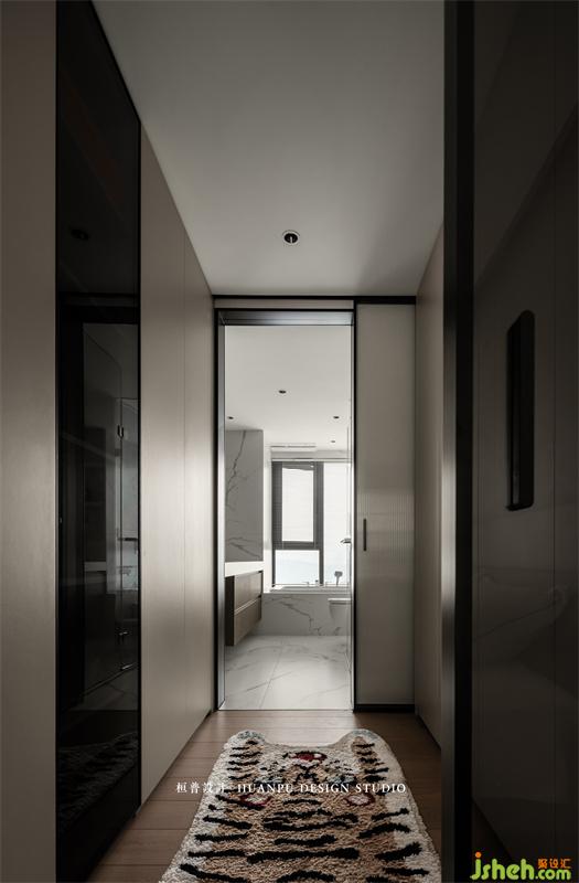 步入式衣帽間,直通衛(wèi)生間,流線簡單,中間用玻璃隱藏門作為隔斷,更好的區(qū)分功能區(qū)域。