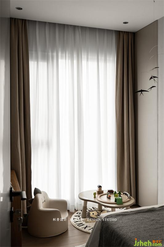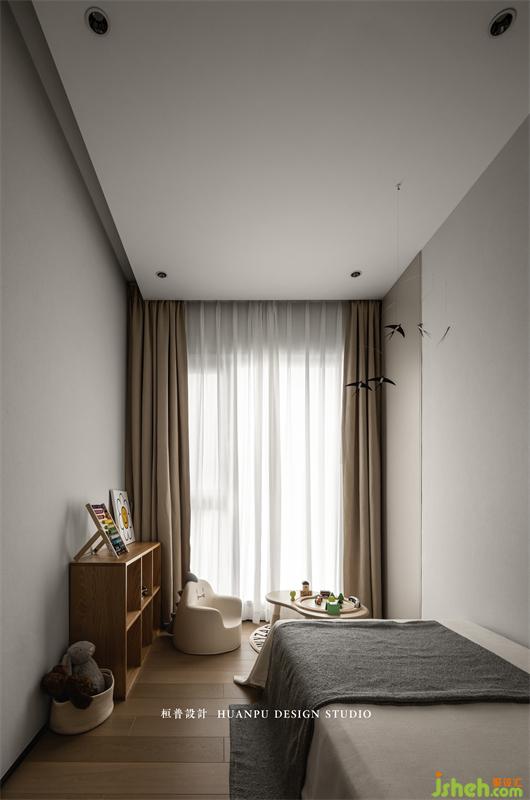 兒童房沒有做太多的固定家具,內(nèi)嵌一組衣柜,其余都采用活動家具,