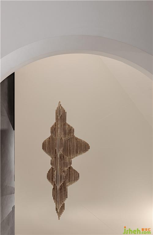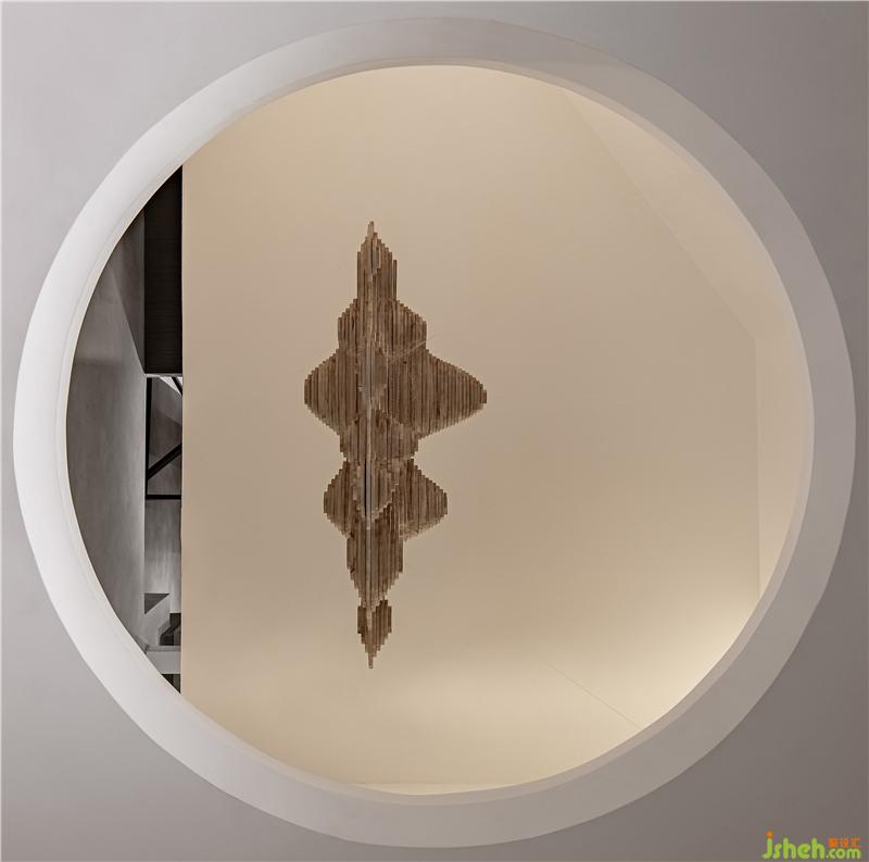木片疊積而成的山景,脫離了地面的束縛,懸浮在空中,在方寸間窺伺方圓,消弭邊界感,為建筑虛擬出別開生面的庭院。