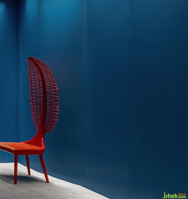 In the lobby, the stacked azure blue rainbow glass undulates like ocean waves, reflecting the light into a shimmering mirage; the winding front desk is glowing with metallic luster, as if it is flowing slowly. With a quick glance, the mood seems to have reached the estuary and precipitated a calm coolness.There are two huge overlapping ring installations on the ceiling. The simple sequence enhances the texture of the space, and adds a sense of ritual and mystery at the same time, which implies that there are infinite possibilities hiddenrighthere, and the unrevealed surprises remain tantalizing.