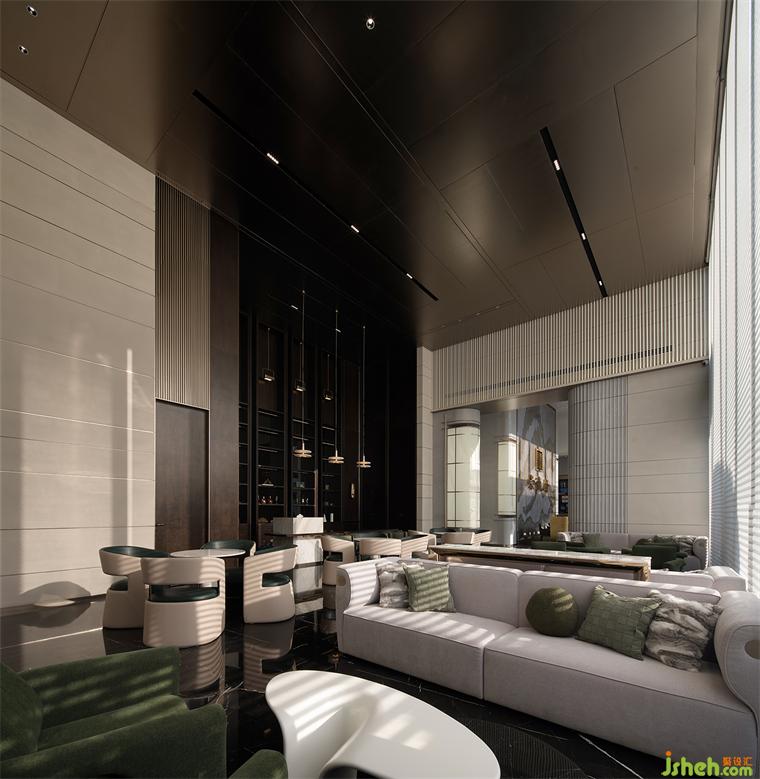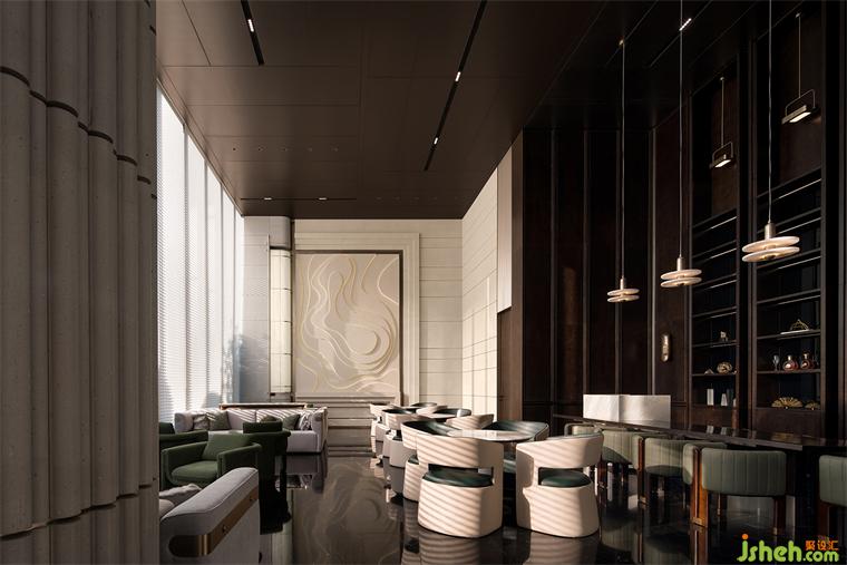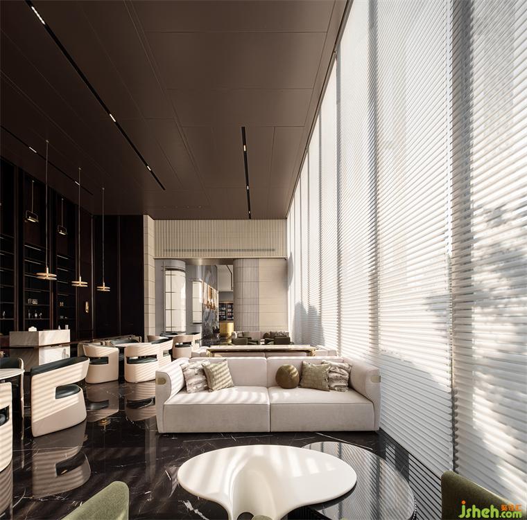 轉(zhuǎn)入開放式綜合洽談區(qū),高挑的屋面與整面條型窗將室外納入。售樓處設(shè)計沉入深棕色的水吧區(qū)將一塊西方古典主義的拼圖嵌入東方當(dāng)代生活,另一面則是與自然相融,松弛、優(yōu)雅、璀璨的現(xiàn)代生活,悠長時間線上的兩點碰撞出超越時間性的精神體驗。