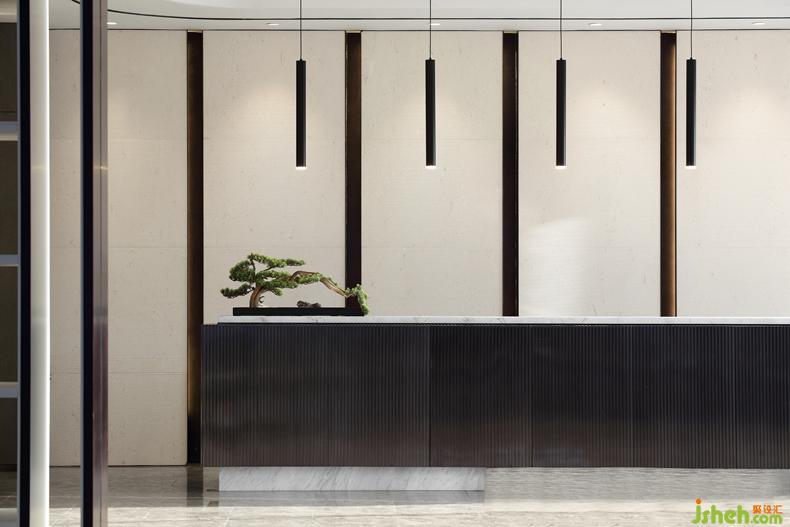 整體空間以面結(jié)合線的設(shè)計(jì)語(yǔ)言,貫穿始終,精致之余亦顯大氣,通過(guò)黑色金屬對(duì)不同材料進(jìn)行收口,與石、與木、或是皮革,有勾線之意,同時(shí)不同材質(zhì)總能碰撞出不一樣的火花。接待背景的石頭做了肌理面處理,仿佛訴說(shuō)著本該有的自然,眼前一株迎客松與之遙首相望,靜逸。