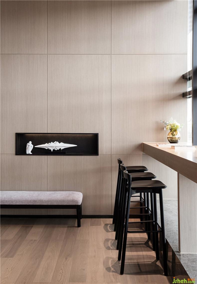 臨窗一隅可眺望清幽,靜謐的白龍?zhí)?,喚起人心中對自然的崇拜和向往。對話區(qū)整體布局疏落有致,材質(zhì)的溫潤與藝術(shù)品的雅致自成一副休憩情境。