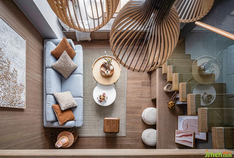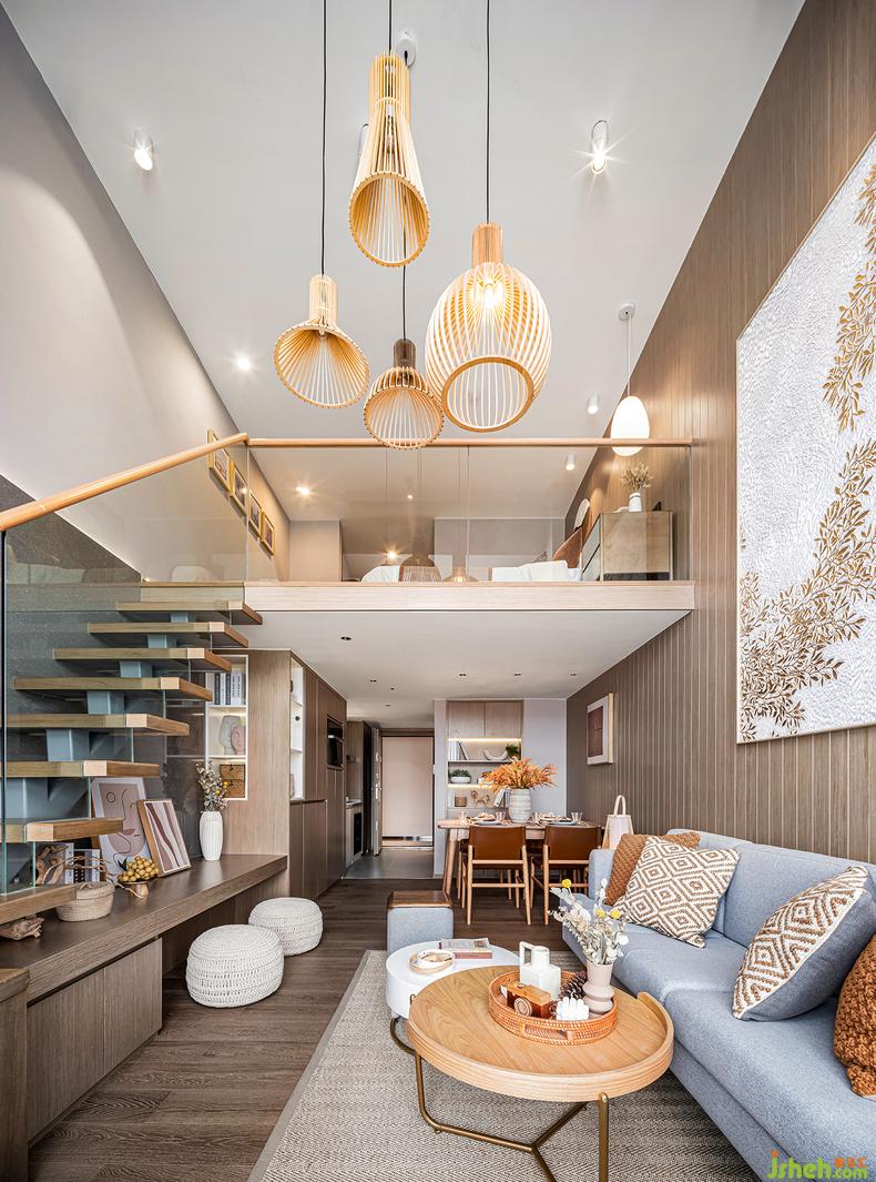 約4.5米的層高消除了空間的閉合感,木色沿著過道爬上地面和墻面,帶來秋天恬靜的氣息。樣板房設(shè)計(jì)籐編藝術(shù)吊燈與光的柔美結(jié)合,充分體現(xiàn)出自然材質(zhì)的美感