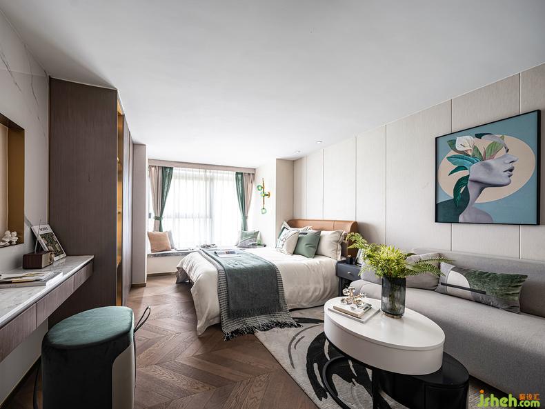 藍(lán)綠色作為藍(lán)色和綠色的混合色,代表一種甜美的女性特質(zhì),樣板房設(shè)計(jì)而較淺的藍(lán)綠色可以創(chuàng)造出魅力十足的女性氣質(zhì)。本案中,設(shè)計(jì)師以白色為主,混入藍(lán)綠色,營(yíng)造出獨(dú)特的雅致感,以此契合居者的氣質(zhì)