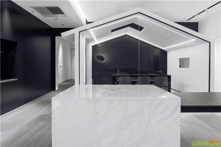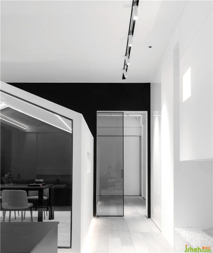 空間里的白屋設(shè)計(jì),避開了把空間直接強(qiáng)行劃分,保留區(qū)域?qū)傩缘那疤嵯录哟笊习肟臻g的通透性。白屋抬高處理,讓行走過程多了些儀式感,白屋子可做辦公室也可以做茶室。白屋的線性燈帶倒影在透明玻璃上的時(shí)候,有一種特殊的邊界感。透過一個(gè)400*700的窗洞再一次產(chǎn)生的空間的互動(dòng)光系。吊頂上面的開窗處理,為了大空間的光線的引入,和空氣的流動(dòng)。