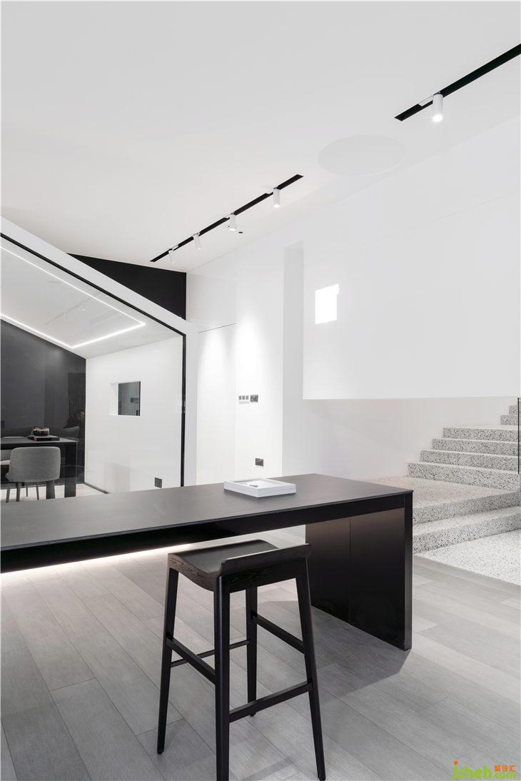連接5.5米挑高的是一個(gè)33步的懸掛樓梯,樓梯平臺(tái)通過4次分割處理,讓每個(gè)平臺(tái)都一個(gè)獨(dú)立的視線框。樓梯的最后的視線墻是一個(gè)懸掛的半墻,透過半墻可以看到有一個(gè)長(zhǎng)形的黑色吧臺(tái)。也可以看到人從半墻后經(jīng)過的動(dòng)態(tài)。適當(dāng)?shù)膮^(qū)域劃分和安全感的設(shè)定在空間種是極其重要的。樓梯頂部的三角切割,原樓板的水泥面,原梁結(jié)構(gòu)的毛面處理,新筑的水泥漆吊頂。細(xì)膩與粗曠、整齊與不束、白與灰、原始與現(xiàn)代、一起在《有間》中關(guān)聯(lián)起來了。