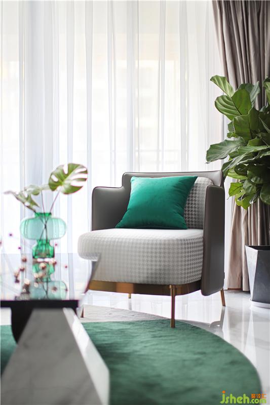 黑白灰基調(diào),祖母綠連貫整個(gè)客廳,落地靠畫加大了整個(gè)空間的體魄感,大氣又不失靈動(dòng),翩翩起舞,原形地毯色彩分割剛好延續(xù)著祖母綠,燈具剛好呼應(yīng)硬裝的不銹鋼金屬條,茶幾上的分子擺件也跟隨著,整個(gè)空間環(huán)環(huán)相扣,正是他們對(duì)待事物的一種態(tài)度;沒有多余的顏色,舒服就好。裝修公司
