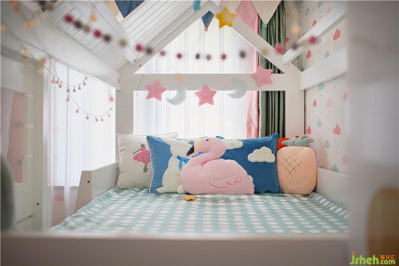 女兒乖巧可愛,是爺爺奶奶開心果,房型床是他們給她最好的保護(hù),一個(gè)屬于她一個(gè)人的空間;星星月亮只屬于她一個(gè)人,床上都是她喜愛的樣式抱枕。樣板房設(shè)計(jì)