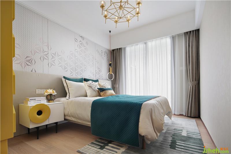 黑白灰的光影,暖暖的窗簾和床呼應(yīng),安靜溫暖的床,是小兩口最私密的空間,床頭是他們最愛的攝影作品,床上祖母綠流蘇抱枕正是女人柔美的象征。樣板房設(shè)計(jì)