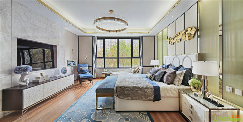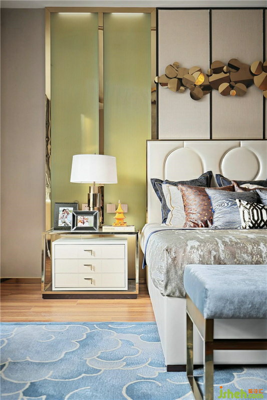 色彩鮮明的壁畫組合為奢華的空間之中增添了更多的藝術(shù)氣息,柔和的質(zhì)感中和了金屬、瓷磚的冷硬,帶來更舒適的審美享受。樣板房設(shè)計