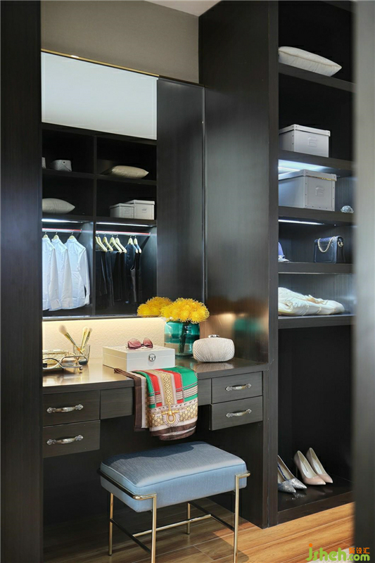梳妝臺(tái)上的大大玻璃鏡讓主人可以全方位映照出自己的身影,臺(tái)上的黃色小雛菊為整個(gè)衣帽間增添了一絲自然的氣息。