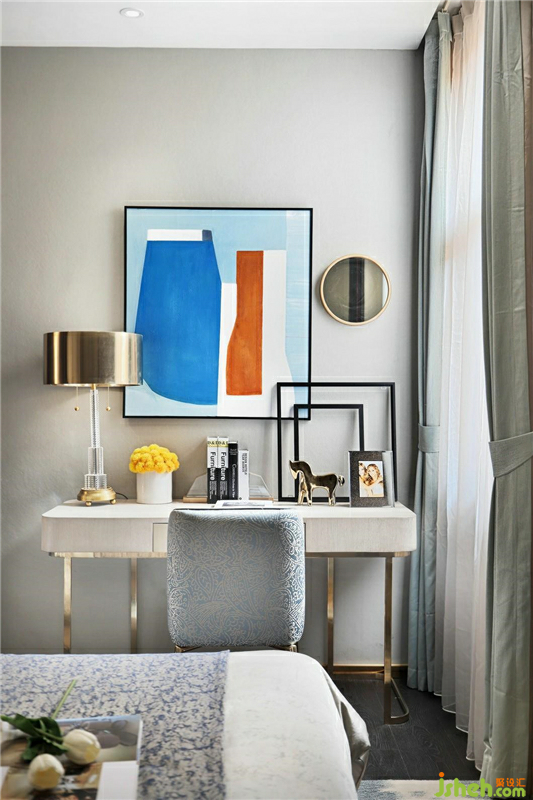 金屬的臺(tái)燈、金屬的桌腳、金屬的鏡框、金屬的裝飾,這一連串金屬元素的運(yùn)用讓這一角落更加靈動(dòng)?;野咨浺魏桶咨烂妫渖{(diào)的調(diào)和讓人可以安靜下來。