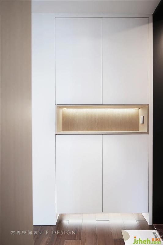 玄關以簡約為主,整體干凈簡潔。中間開放擺臺采用嵌入式燈帶,開放式空間放小件物品取放更便捷。底部開放式,出入拖鞋方便擺放。