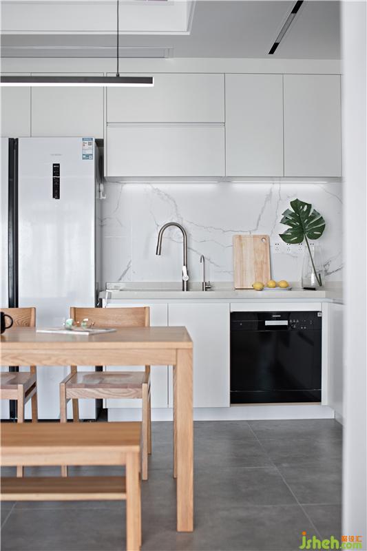 開放式廚房,材質(zhì)上的軟硬對(duì)比,寬敞的空間,干凈的墻壁,白色的櫥柜,整體干干凈凈,使這個(gè)廚房簡(jiǎn)約,而又不簡(jiǎn)單。
