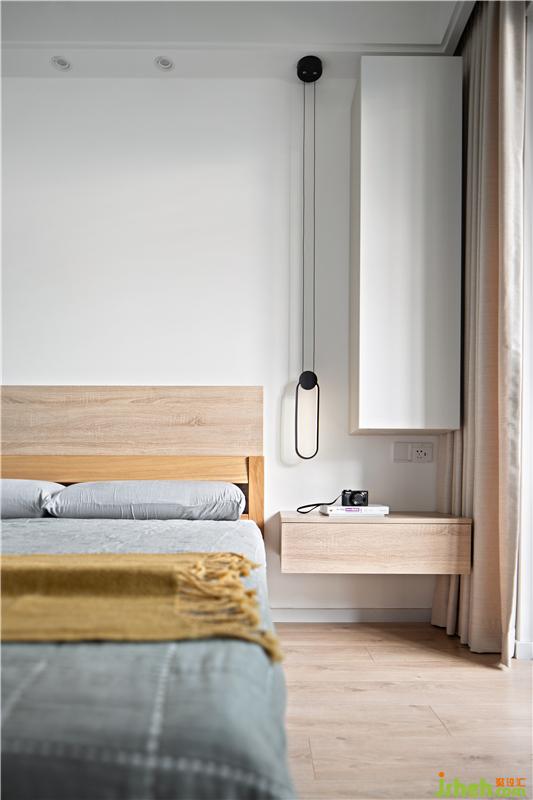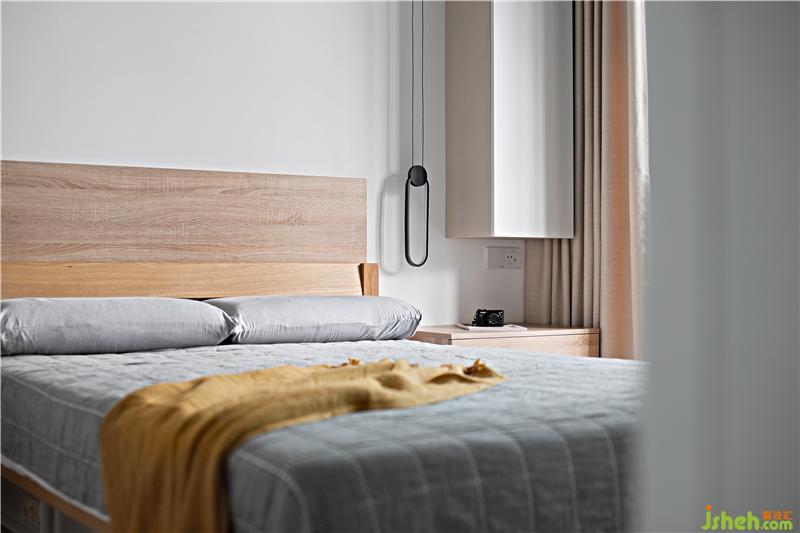 主臥,家具也都是延續(xù)了客餐廳的原木風格,搭配溫柔的灰色,大面積留白,使臥房更加溫潤明亮,營造理想的睡眠環(huán)境;整面的儲物柜保證房間的干凈整潔。