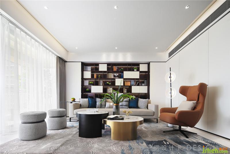 而旁選用一盞落地?zé)糇鳛檠b飾,旁邊的橘色單人沙發(fā)椅也在空間中添了一抹色彩,豐富了空間的視覺(jué)效果。
