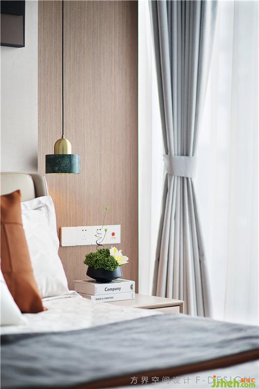 父母房的床屏兩側(cè)的簡約精致吊燈,散發(fā)出溫馨的燈光,橘色給人帶來暖意,而整面的落地窗投入自然的光感,干凈清透無負(fù)擔(dān)。