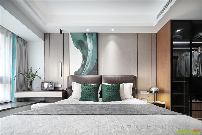 主臥用深淺色調(diào)搭配,彌漫著靜謐安寧的氛圍,沉靜理性,給業(yè)主休憩提供了安靜的環(huán)境。床頭靠背的一幅墨綠色裝飾畫,亦為空間增添一抹亮色。