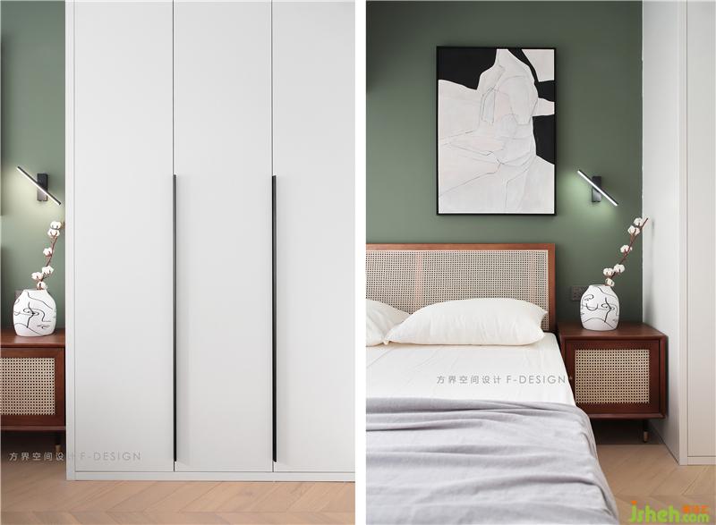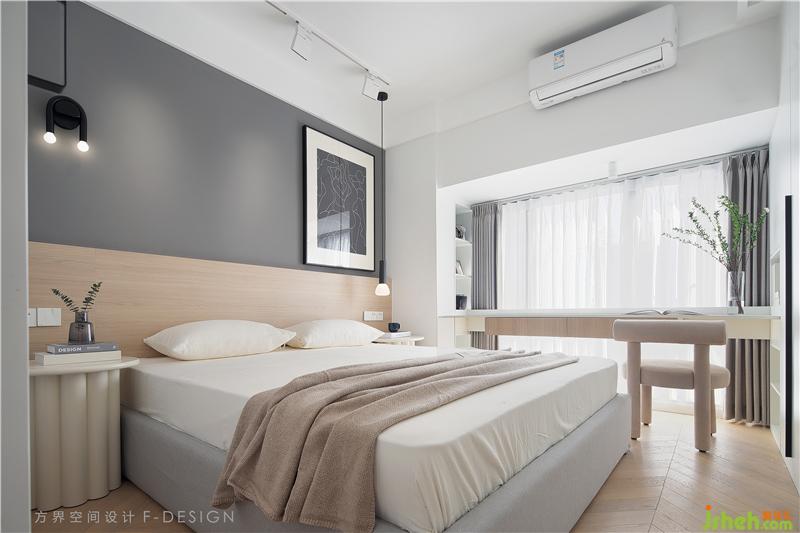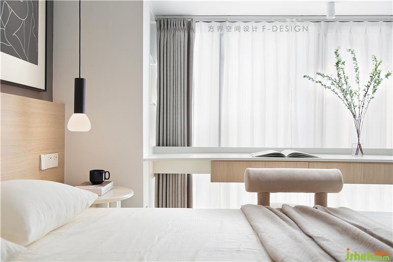主臥以簡(jiǎn)單、素雅為主,整個(gè)空間用了飽和度比較低的顏色來搭配,治愈系的米色系床單搭配木色更顯的柔軟細(xì)膩,整個(gè)空間溫潤(rùn)而平靜。
