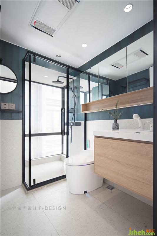 長(zhǎng)條方形藝術(shù)磚搭配水磨石,上方設(shè)計(jì)了一整面的鏡柜,底下的儲(chǔ)物空間,即滿足了收納需求,也顯得衛(wèi)生間干凈整潔。