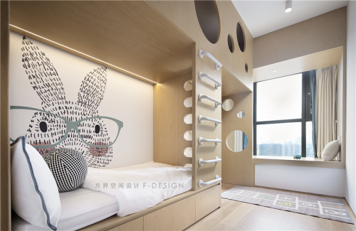 3、次臥做成了兩用的功能房,大型書桌滿足業(yè)主玩電腦辦公,靠墻做了收納柜和一張隱形床家里來(lái)客人了可以放下來(lái)做成臥室。原來(lái)兩邊的圍墻都切割掉換成玻璃推拉門,當(dāng)玻璃門打開整體活動(dòng)走線形成一個(gè)環(huán)圈;