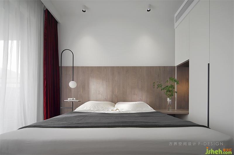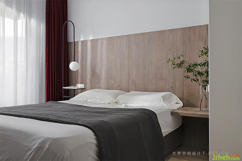 床頭背景墻一半用原木拼接平實(shí)而雅致,在純粹的素色中跳用深紅色點(diǎn)綴,顯盡輕松休閑簡約明靜。