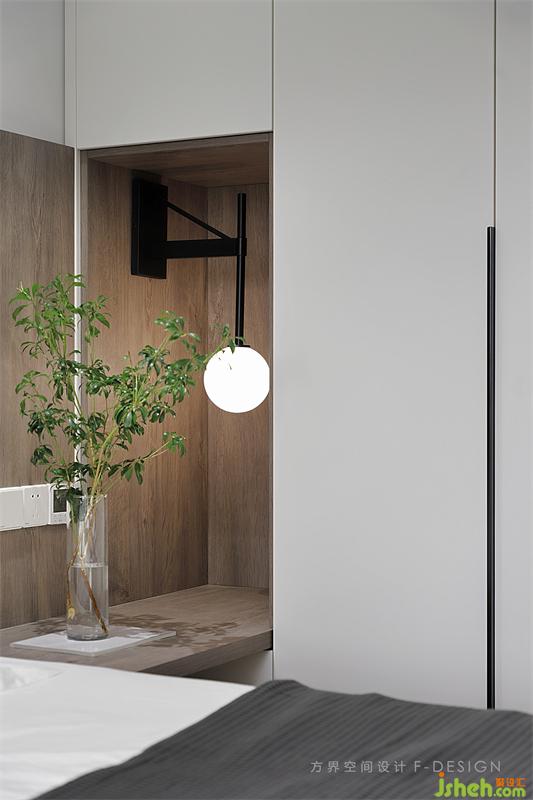 左邊床頭柜用的是線性燈和桌子為一體的組合,右邊是從衣柜延生出來與床頭背景一樣選用樸素含蓄的原木。從衣柜里延生出來的床頭柜增加設(shè)計(jì)美學(xué)且實(shí)用。