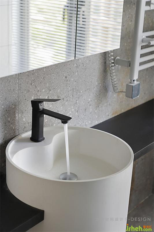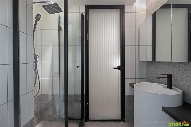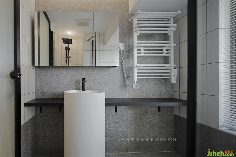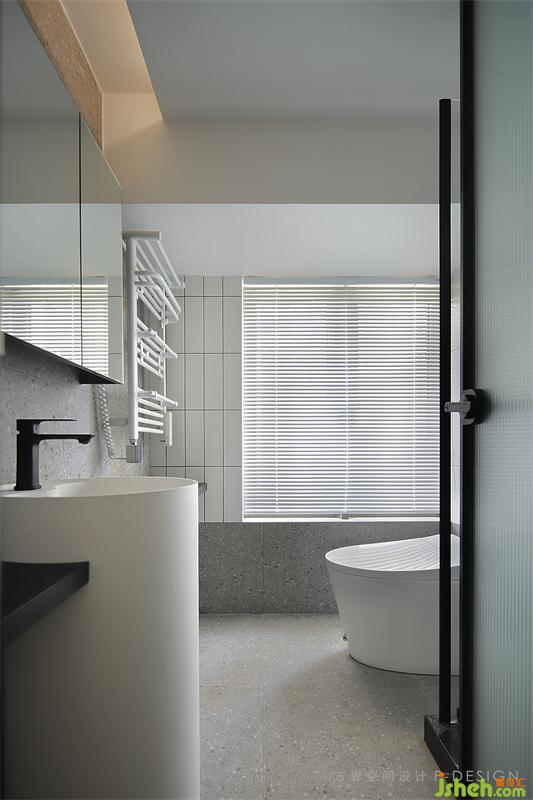水磨石和小白磚的和諧搭配,香格里拉簾隱秘又確保光線明亮。狹小的空間很容易潮濕,利用門開到九十度的后方空間做干濕分離,家居裝修搭配的智能毛巾架(帶有烘干等功能)和智能馬桶(全自動(dòng))都能保證空間的干燥性。