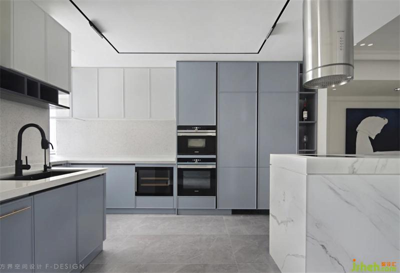 洗碗機(jī)和冰箱做了嵌入式的手法,冰箱加上柜門隱藏起來了 。島臺(tái)做了個(gè)西廚的作用,圓筒抽煙機(jī)下方是電磁爐準(zhǔn)確的抽煙。中西結(jié)合的廚房對(duì)于一個(gè)喜歡做飯的女士來說是必備的。