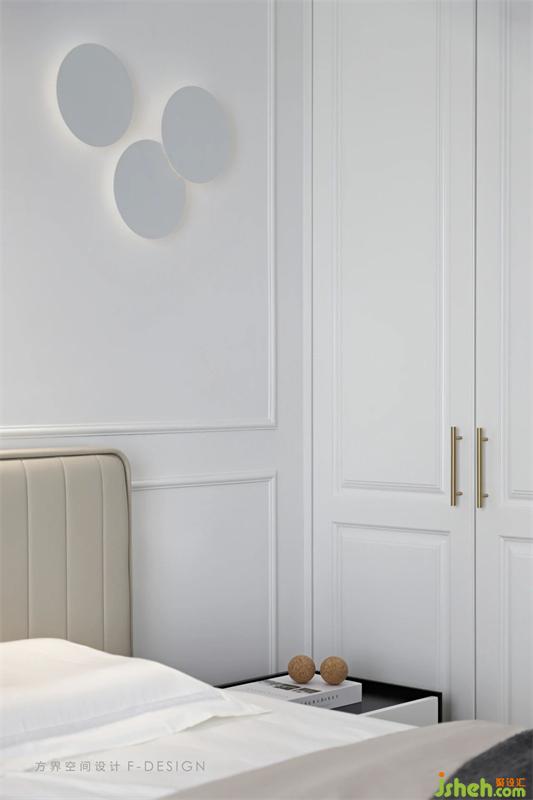 床頭背景的的分割方式,床靠背為分割線上下左右分割,臥室的左右兩邊都設(shè)計(jì)有柜子,左手邊是儲(chǔ)物柜,右邊是衣柜,滿足了儲(chǔ)物功能。