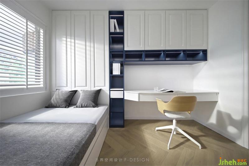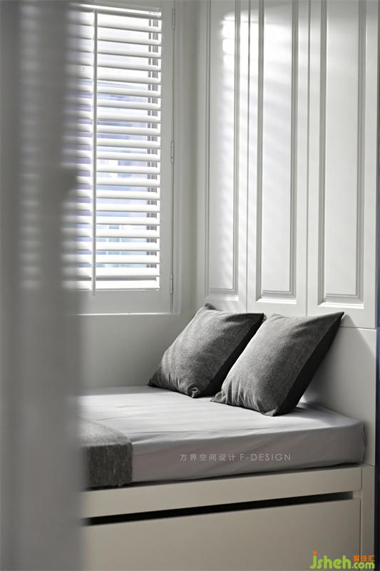 這個臥室的窗戶,沒有用常規(guī)的布藝窗簾,是采用了空氣窗??諝獯笆强梢哉{(diào)節(jié)角度的,關(guān)起來也可以起到遮光的作用。