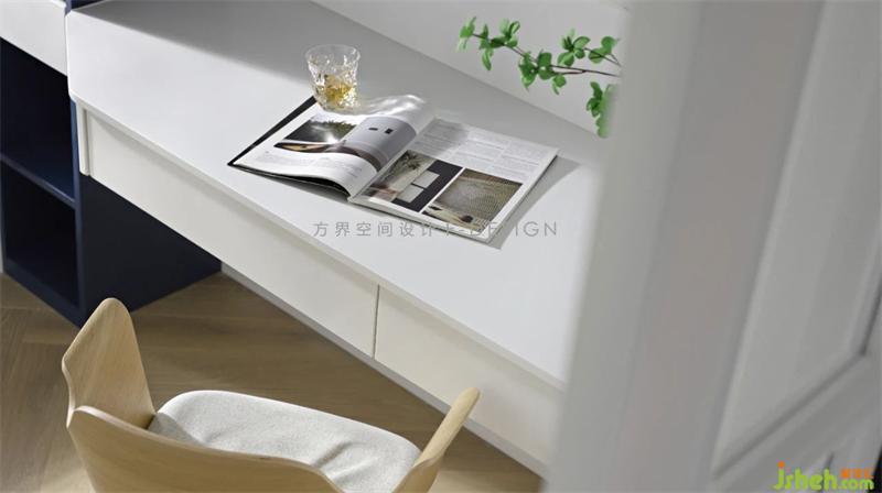 柜子采用白色烤漆板,搭配金屬拉手,讓整個空間的視野更加開闊,明亮。梳妝臺上方用的是異形智能梳妝鏡,打開開關(guān),光線可以柔和空間。