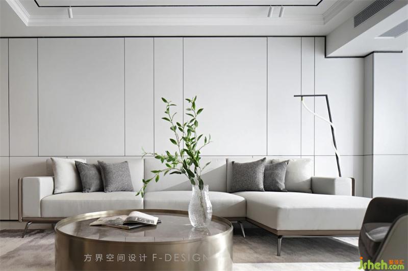 沙發(fā)背景墻用了矩形拼接,拼接處嵌入金屬線條,減弱大面積的空墻給的安全缺失感,利用拼接營造凝聚也提升時(shí)尚
