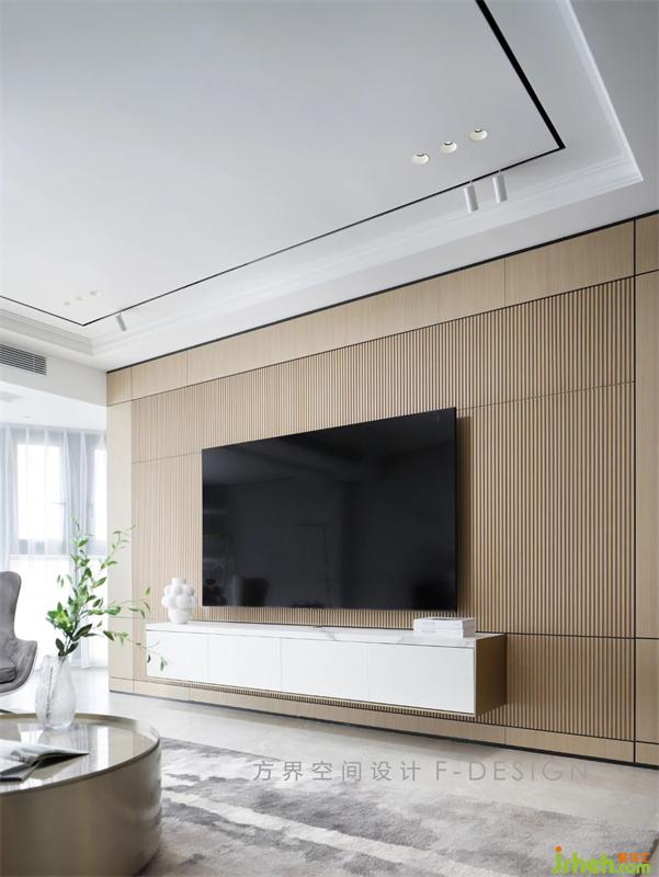 電視背景墻定制了一面的格柵墻雅致別韻,掛壁的電視柜用雅白石材和不銹鋼金屬相退互碰撞,讓整個(gè)空間都有個(gè)銜接。