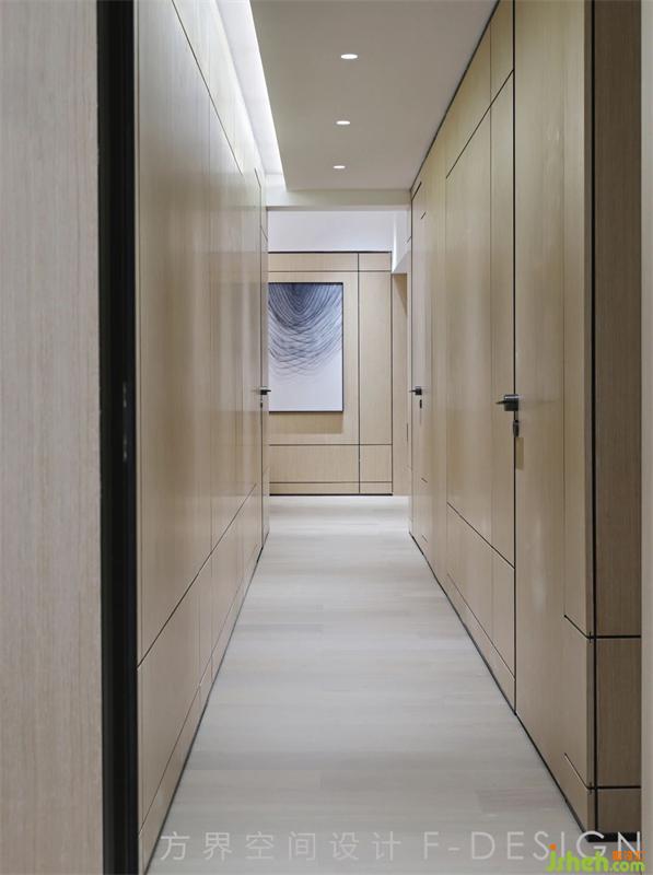 原木的搭配高級(jí)質(zhì)感又溫柔雅致。在筒燈的基礎(chǔ)上旁邊再加一排反燈槽保證走廊的光線(xiàn)。