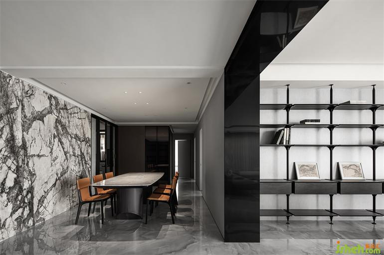 墨色肌理的大理石墻面,惠州私宅設(shè)計(jì)搭配木質(zhì)錯(cuò)落的置物架,奔放且不失秩序感。