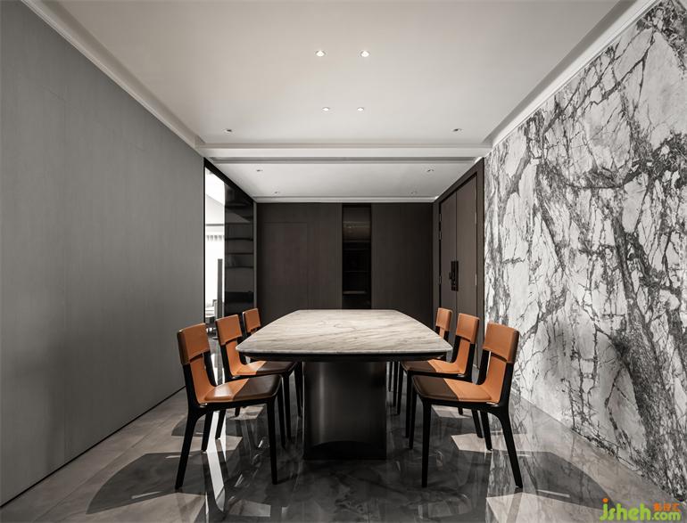 惠州私宅設計優(yōu)雅有型的尊貴質感搭配大理石的自然紋理兼具藝術美感,金屬質感桌腿更為堅實穩(wěn)固。