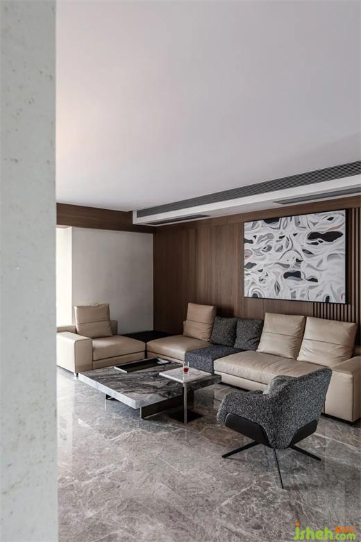 沙發(fā)運用皮質(zhì)與布料完美結(jié)合的精湛工藝,華潤幸福里公寓設(shè)計通過力學(xué)和美學(xué)的完美融合,塑造舒適體驗和超凡氣質(zhì)