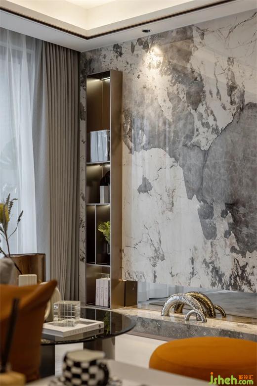 簡潔的線條,干凈沉穩(wěn),水墨紋理大理石柜面溫潤質(zhì)感,德威樣板房設(shè)計將客廳變成一座博物館,出入即是一種專屬的藝術(shù)享受。