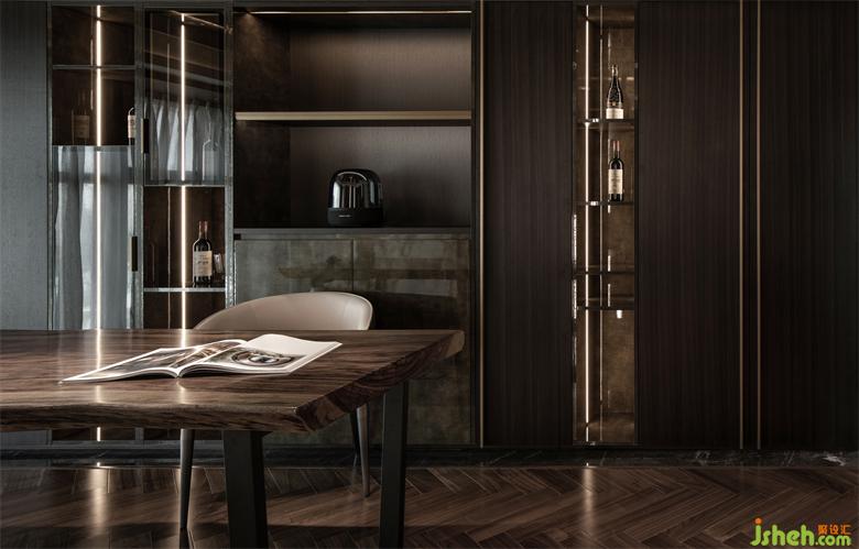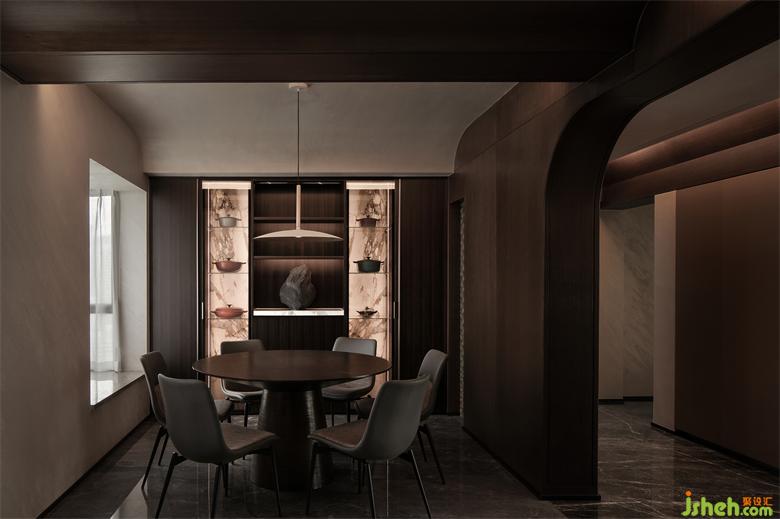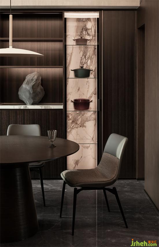 毗鄰的開放式餐廳空間,與廚房空間整體融合,TRID添睿室內(nèi)設(shè)計(jì)視覺上拉長空間的感官,相對(duì)獨(dú)立的空間裏,優(yōu)美的圓弧線帶來一種柔性之美。