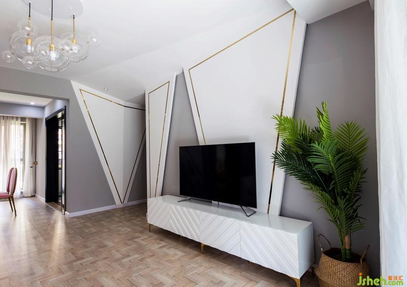 電視背景-分明的灰色和白色配上利落的三角形造型,點綴金色的金屬條,帶入些許科技感,再配上綠植,使空間清新自然,就好像在炎熱夏日里的一處清涼。